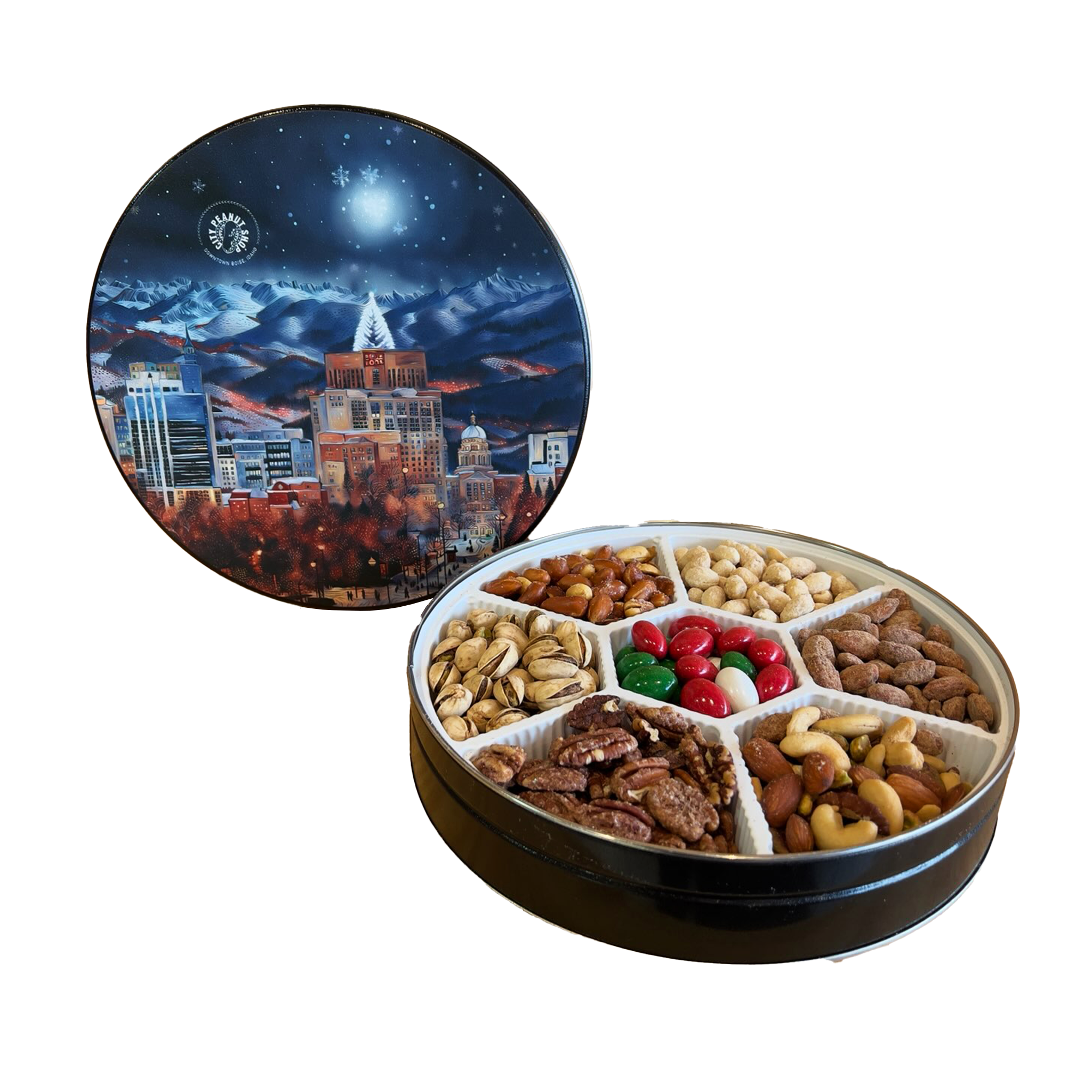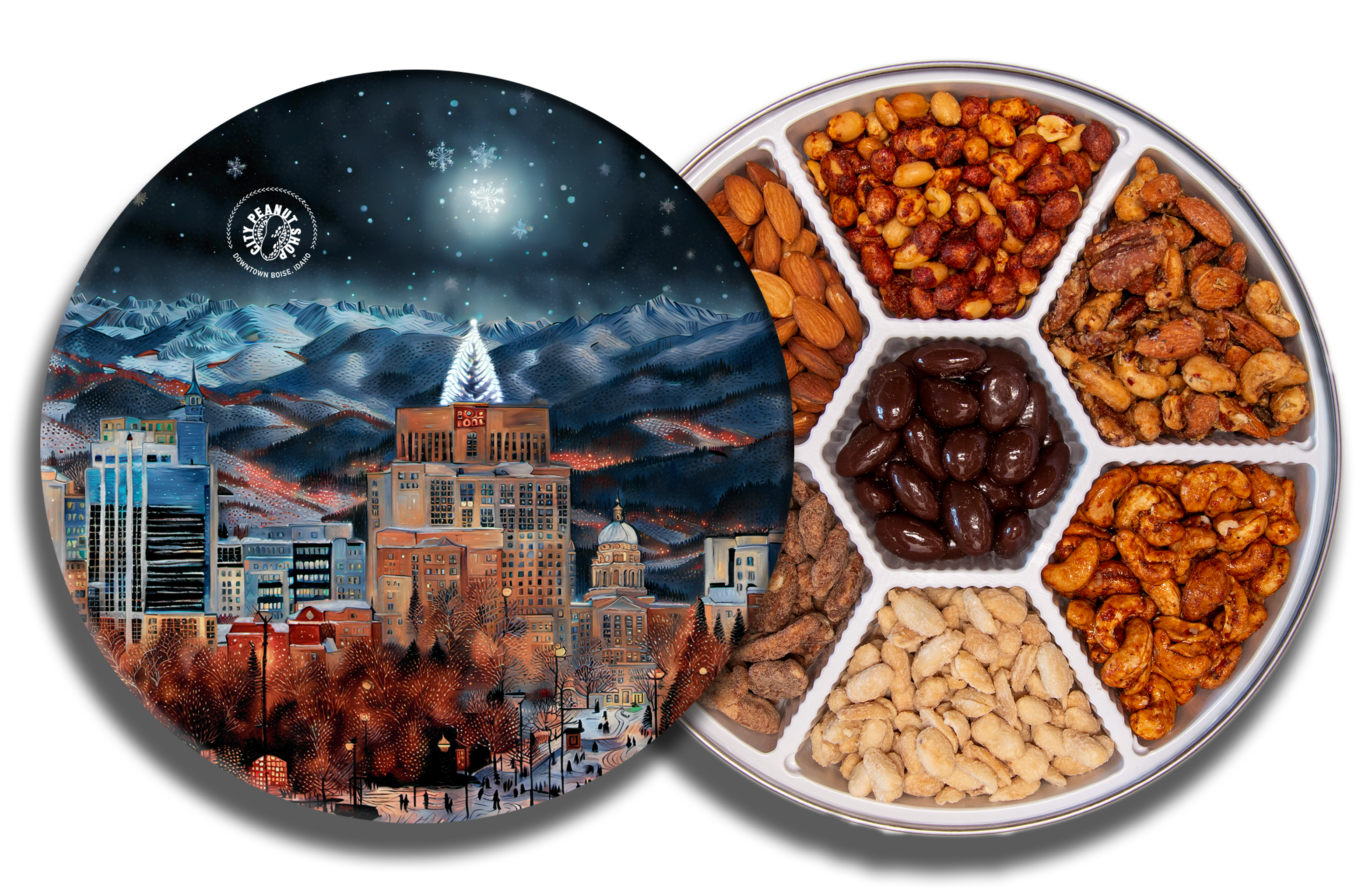 This tin is back by popular demand.  Designed by Arthur Balluff and produced in the USA.  It features our spectacular Boise nightscape, and is loaded with 2 pounds of delicious nuts roasted by City Peanut Shop in Downtown Boise, Idaho.